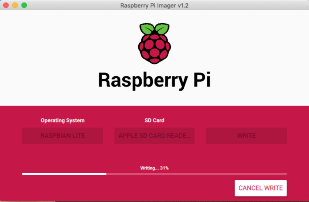 Once downloaded open it, firstly we choose the OS, which you choose is ultimately your choice, for this we are going to choose Raspbain (Other), then the Lite option – we don’t need the Desktop for this, plus its the smallest download size. Now select your SD Card, then click Write. Sit back while it does the work for you 🙂